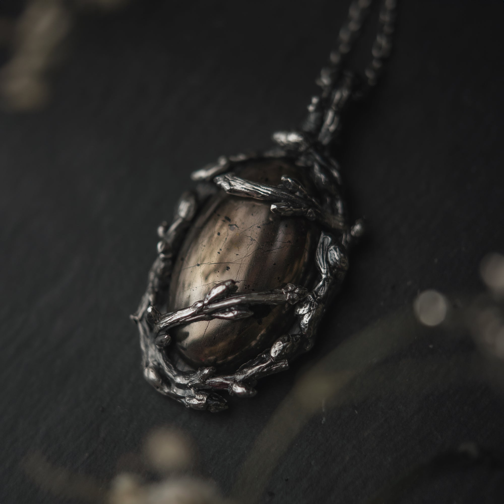 Pendant with natural pyrite, entwined with forest branches, cast in silver